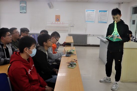 赛前,参赛学生积极准备,将参赛作品摆放在指定区域,相互讨论,争分夺秒地对电路进行最后测试。赛场上,每位选手依次上台向评委们展示自己的作品,选手们神情专注,充分运用所学知识,发散自己的思维,使所焊接的电路别出心裁,选手们精益求精,在指甲盖大小般的芯片上铆接节点,展现了较高的专业素养。一圈圈LED灯在大家的操作下璀璨夺目。“心形流转灯”、“光立方”、“埃菲尔铁塔”等作品一打开,彩色的灯光来回变换,样式层出不穷,各自绽放光芒,让人眼前一亮,美妙至极,同时也让人体会到工科的浪漫。选手们利用所学知识并结合所编程的程序语句,向评委详细讲述自己的创意想法并由评委做出点评。随后,评委根据展示情况进行打分,其中李淑敏的“光立方”凭借其独特的构造以及电路设计脱颖而出,获得了大家的一致好评,夺得本次焊接大赛的第一名。最后由评委代表作总结发言,他赞扬了同学们顽强的团队合作精神和严谨认真的实践态度。
