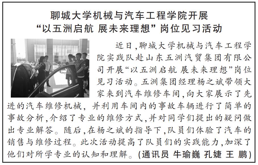 近日,ok138cn太阳集团古天乐实践队赴山东五洲汽贸集团有限公司开展“以五洲启航 展未来理想”岗位见习活动。五洲集团经理杨之斌带领大家来到汽车维修车间,向大家展示了先进的汽车维修机械,并利用车间内的事故车辆进行了简单的事故分析,介绍了专业的维修方式,并对同学们提出的疑问做出专业解答。随后,在杨之斌的指导下,队员们体验了汽车的销售与维修过程。此次活动提高了队员们的实践能力,加深了他们对所学专业的认知和理解。(通讯员 牛瑜巍 孔婕 王鹏)